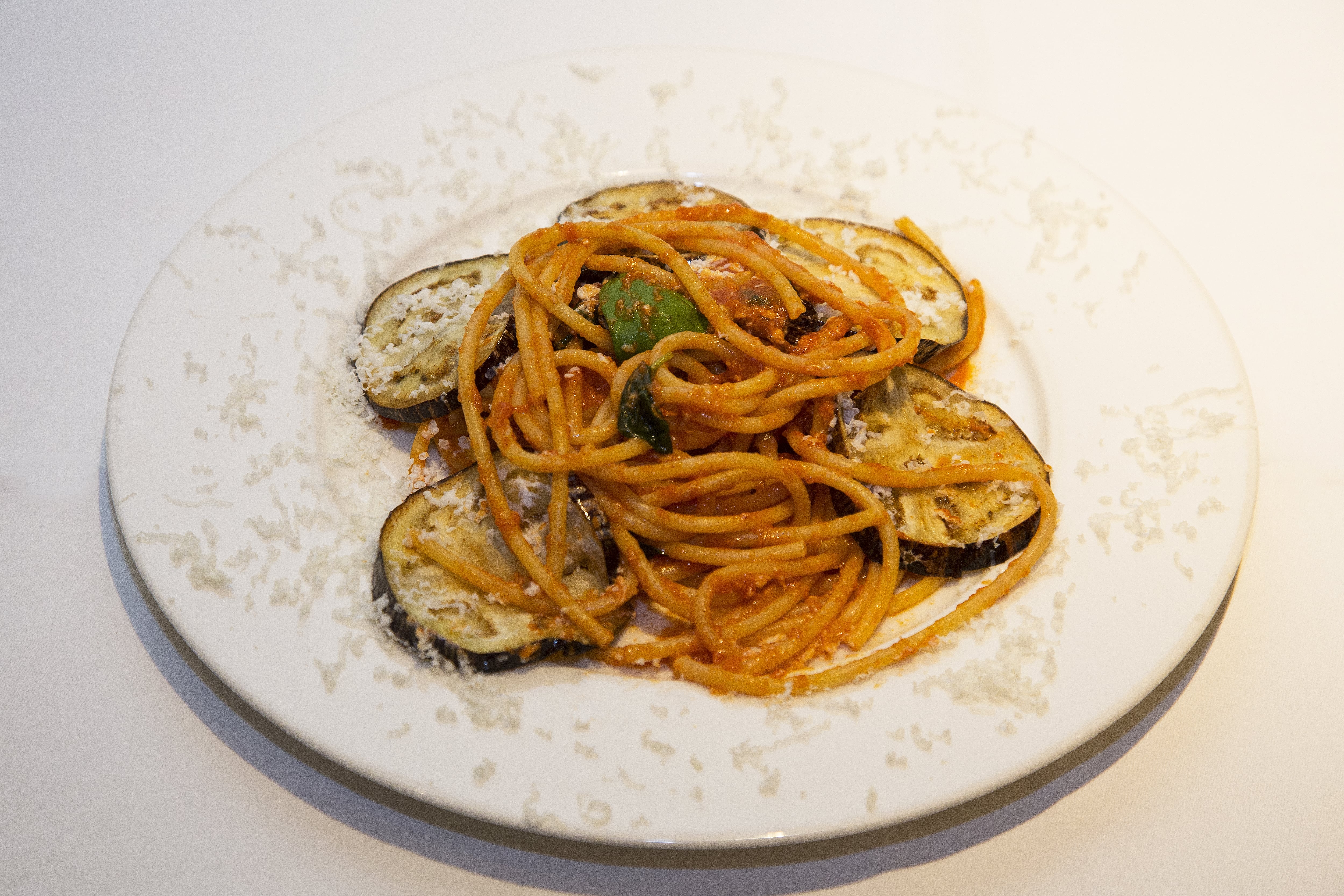 Place the fried aubergine slices on each serving plate topped with some crumbled salted ricotta, divide the pasta into portions and add to each plate, and garnish with a few leaves of basil.