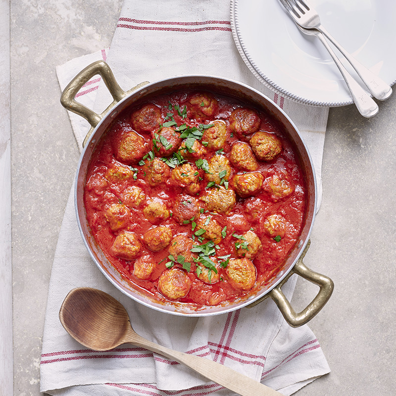 Meanwhile, make the tomato sauce. Sweat the onion in a little olive oil in a heavy pan over a medium heat until soft and translucent. Add the tomatoes and season with salt and black pepper. Transfer the meatballs to the sauce and cook for 10 minutes to heat through.